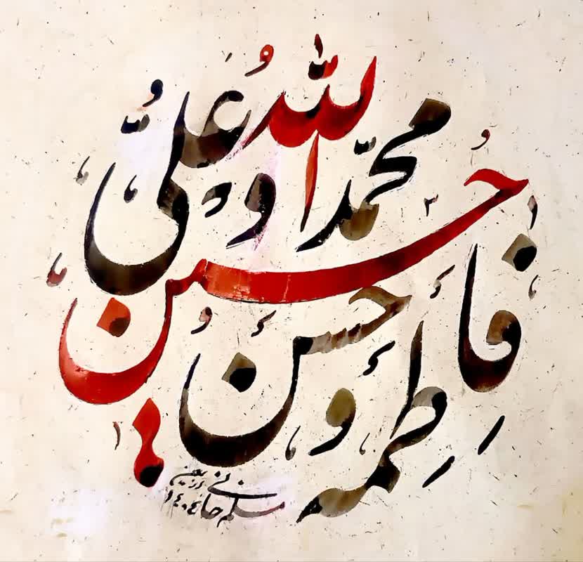الله، محمد، علی، فاطمه، حسن و حسین علیهم السلام" "با خطاطی آقای محمد مسلم خانی"