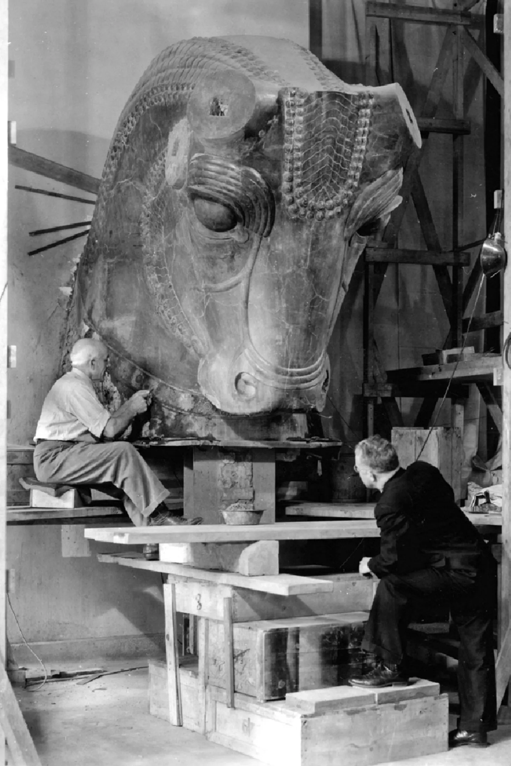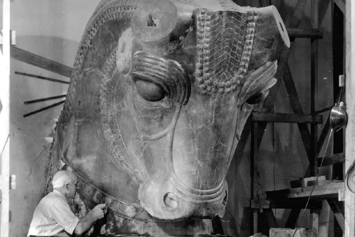 تصویر تاریخی، لحظه مرمت یک گاو سنگی هخامنشی در دانشگاه شیکاگو را نشان میدهد.