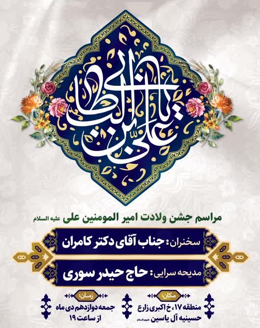 جشن باشکوه ولادت باسعادت برادر و وصی رسول الله(صلوات الله علیه)، امام المتقین، امیر المؤمنین، علی ابن ابیطالب علیه السلام، با حضور شما شیعیان دلداده آن حضرت به شرح ذیل برگزار می گردد: