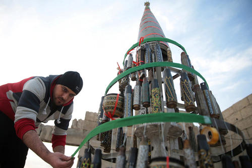 عکس/ساخت درخت کریسمس با پوکه گلوله های جنگی – شهر دوما در سوریه