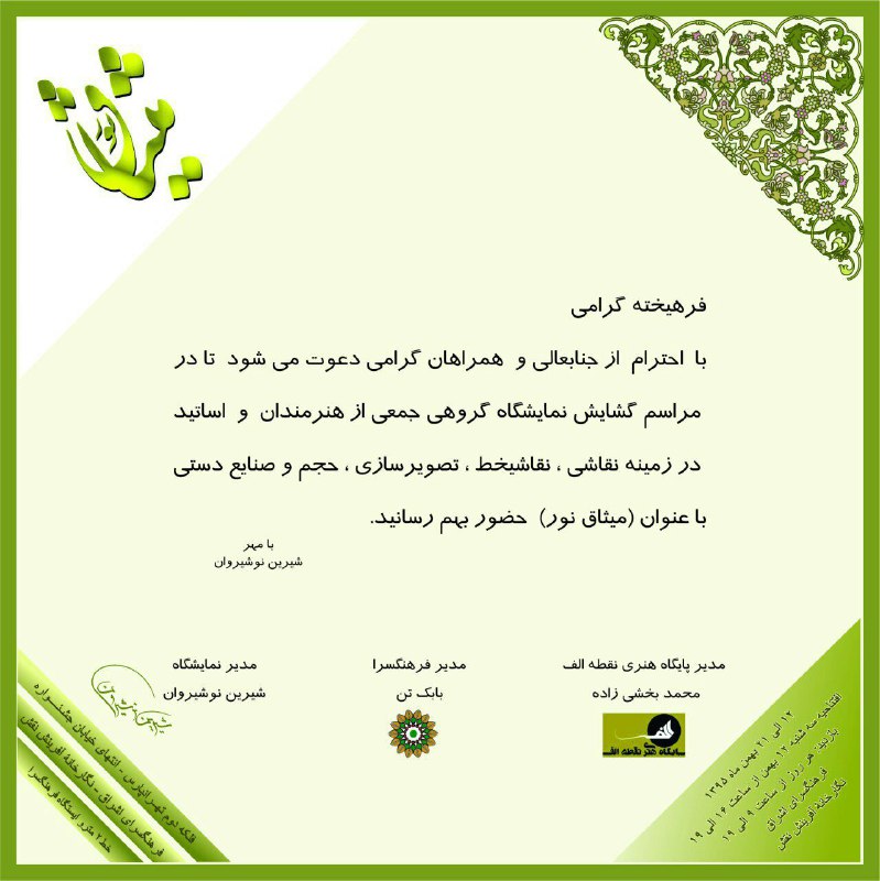 میثاق نور: ''نمایشگاه گروهی'' افتتاحیه همزمان با دهه مبارک فجر 12 بهمن ماه