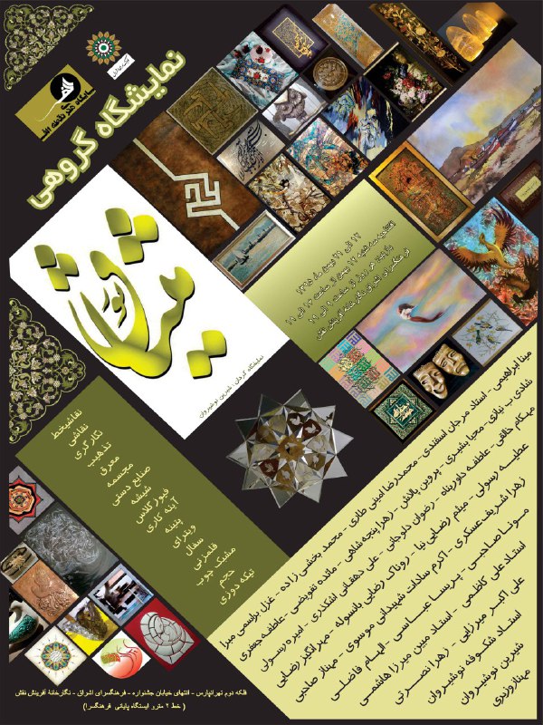 نمایشگاه گروهی میثاق نور با آثاری در شاخه های نقاشیخط - نقاشی - نگارگری - تذهیب - معرق - مجسمه - صنایع دستی - شیشه -فیوز گلاس - آینه کاری - پتینه ویترای - سفال - قلم زنی - مشبک چوب - حجم