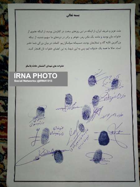 در بیانیه قدردانی خانواده شهدای آتش نشان حادثه پلاسکو خطاب به ملت ایران تصریح شده، کلمات در بیان بزرگی شما حقیر است، حالا ما همه یک خانواده ایم، پس به این شهدا و به این اعضای خانواده تان افتخار کنید.