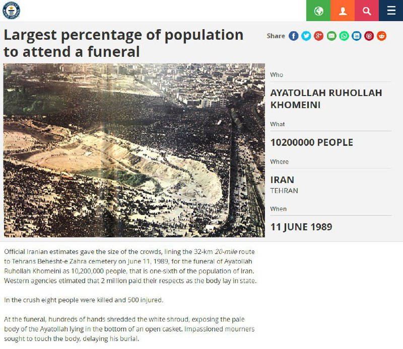 مراسم تشییع پیکر امام خمینی(ره) به عنوان مراسمی با بیشترین تعداد شرکت کننده در کتاب گینس ثبت شده است