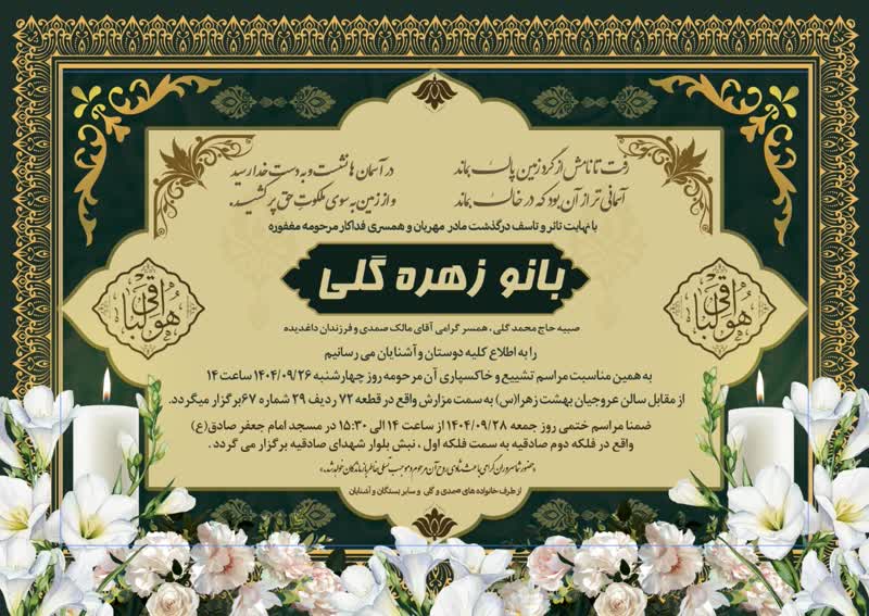 هیئت انصارالخمینی (ره) درگذشت آن بانوی متدینه و عضو واحد خواهران این هیئت را خدمت خانواده ی سوگوار، بویژه اخوان معزای گُلی ، صمیمانه تسلیت گفته ، از پیشگاه خالق رحمان و رحیم برای آن ساکن دیار دوست همنشینی با حضرت صدیقه ی طاهره سلام الله علیها و برای کلیه ی بازماندگان شکیبایی و سلامتی مسئلت می نماید.
