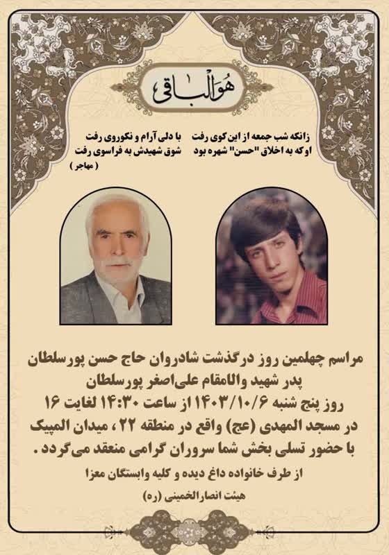 برگزاری مراسم چهلمین روز درگذشت شادروان حاج حسن پورسلطان