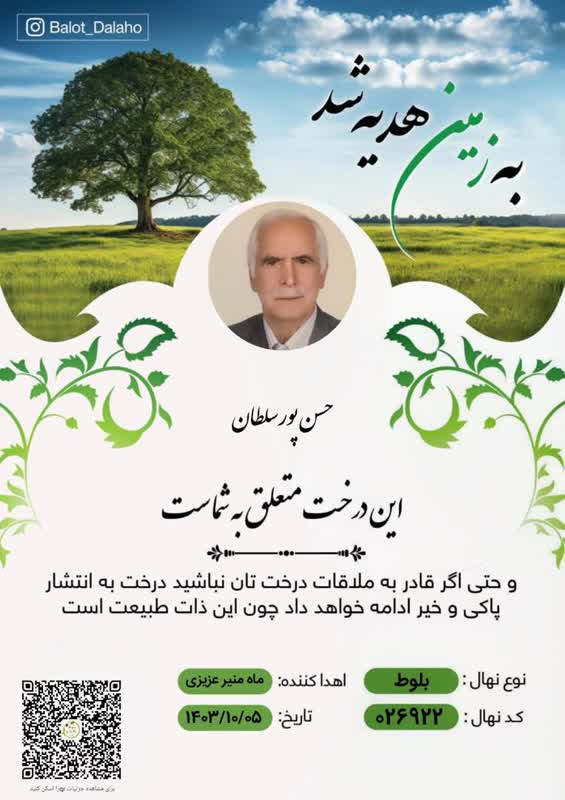 کاشت یک اصله نهال: در پی آسمانی شدن شادروان حاج حسن پورسلطان / ااقدامی ارزشمند و ماندگار از سرکار خانم ماه منیر عزیزی