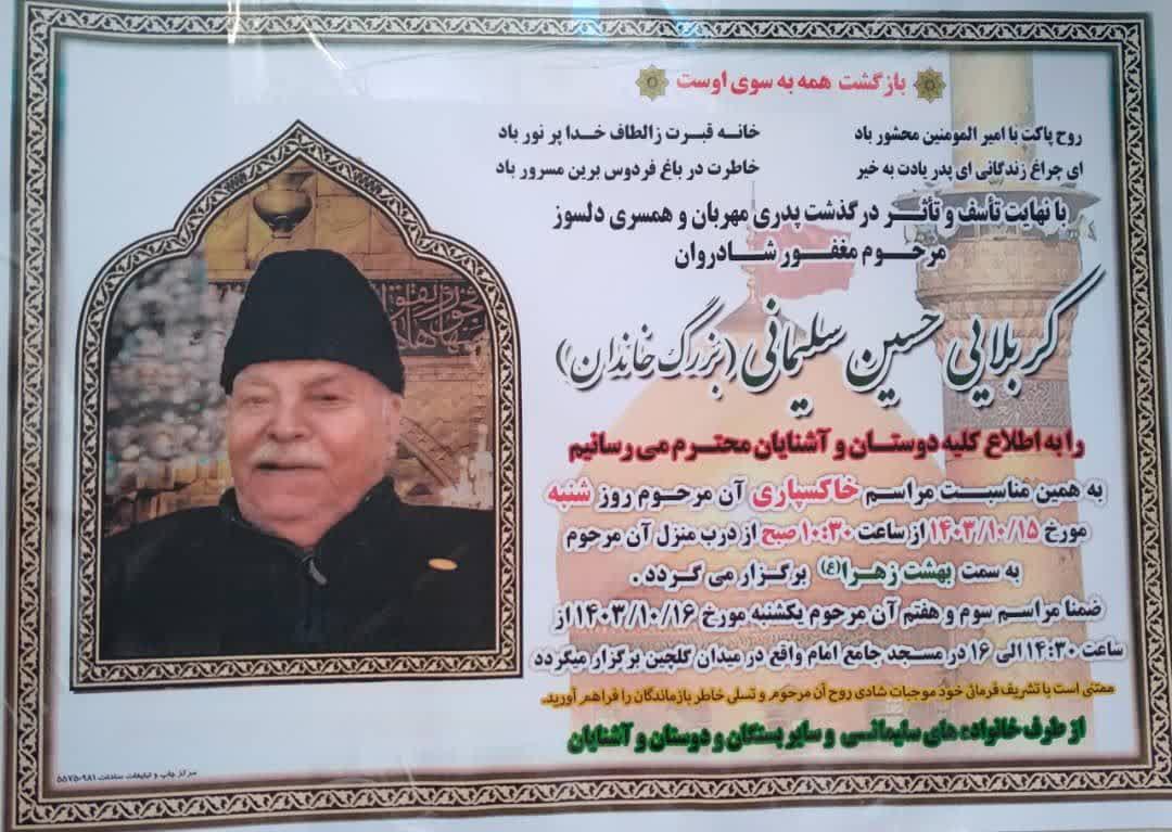 پوستر و اطلاعیه تسلیت هیئت انصارالخمینی (ره): مرحوم مغفور (کربلای حسین سلیمانی) عموی گرامی حاج ناصر سلیمانی به دیار معبود شتافت