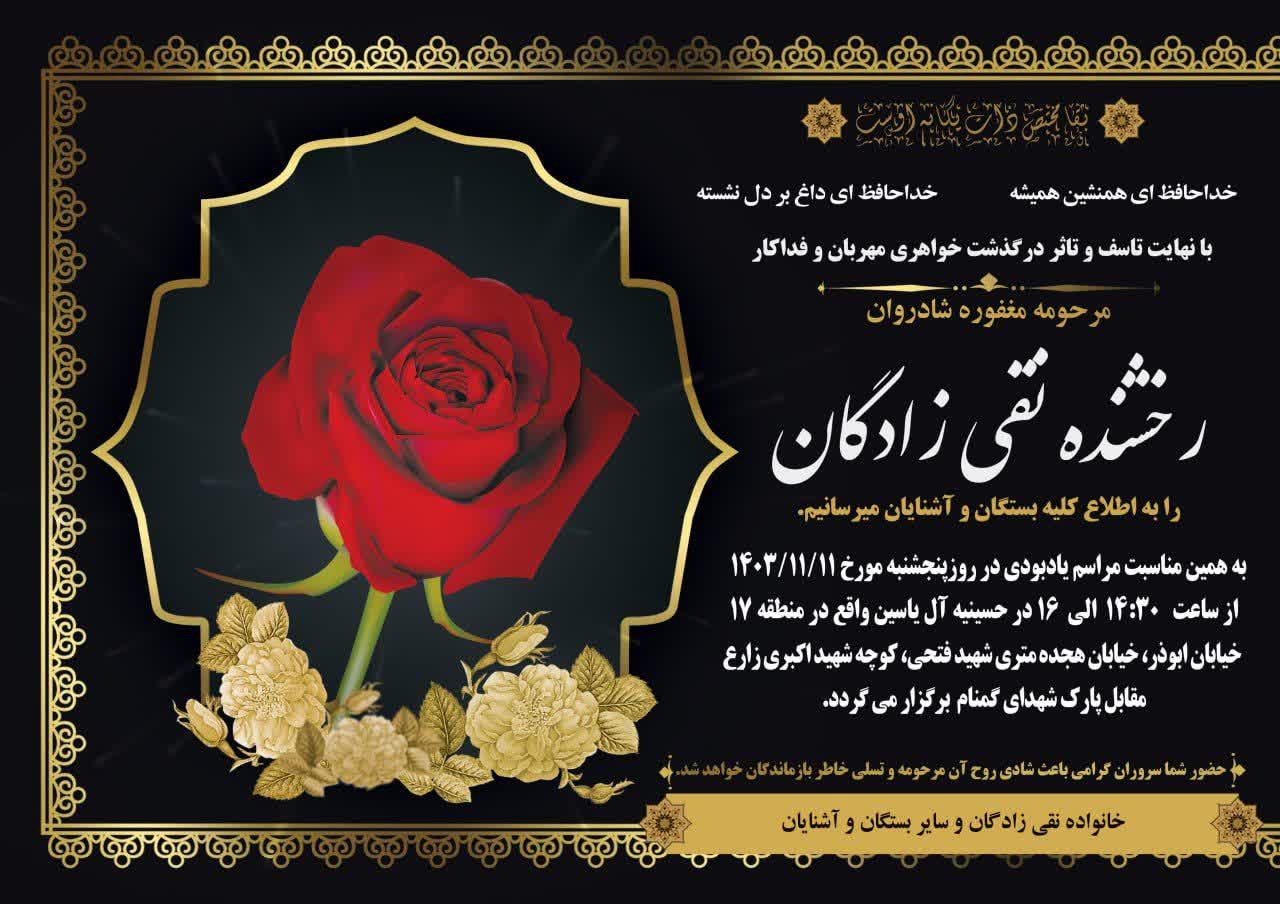 اطلاعیه ی برگزاری مراسم یادبود همشیره محترمه ی آقای حاج عظیم نقی زادگان