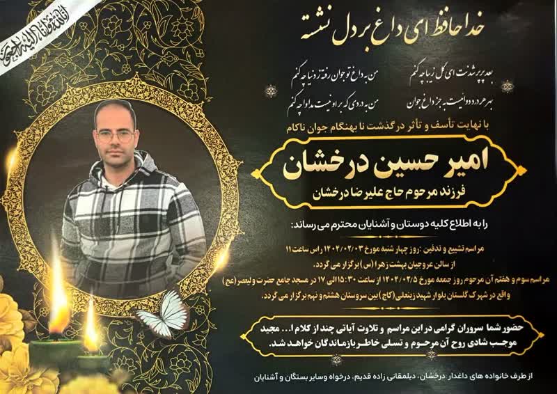 بانهایت تألم و تأثر درگذشت جانگداز مرحوم مغفور،« امیرحسین درخشان » فرزند شادروان حاج علیرضا درخشان و برادر زاده ی همسر گرامی حاج مجید نگهبان را به آگاهی دوستان و آشنایان می رساند.