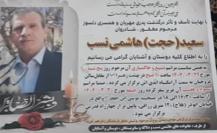 اطلاعیه بزرگداشت و تسلیت: مرحوم مغفور هاشمی نسب ، همسر همشیره ی مومنه ی شهید احمد دلاکه (دالکه) به دیدار حق شتافت