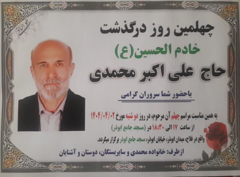 اطلاعیه: برگزاری مراسم چهلمین روز درگذشت خادم الحسین (ع) حاج علی اکبر محمدی