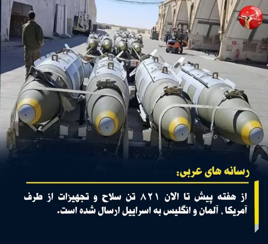 رسانه های عربی: از هفته پیش تا الان ۸۲۱ تن سلاح و تجهیزات از طرف آمریکا ، آلمان و انگلیس به اسراییل ارسال شده است