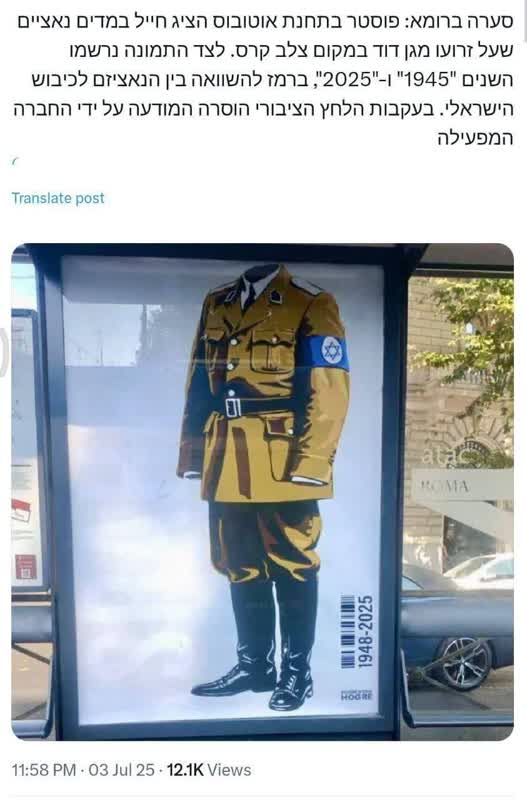 در کنار تصویر، دو سال «۱۹۴۵» و «۲۰۲۵» نوشته شده بود، بهعنوان اشارهای به تشبیه نازیسم با اشغالگری اسرائیل.