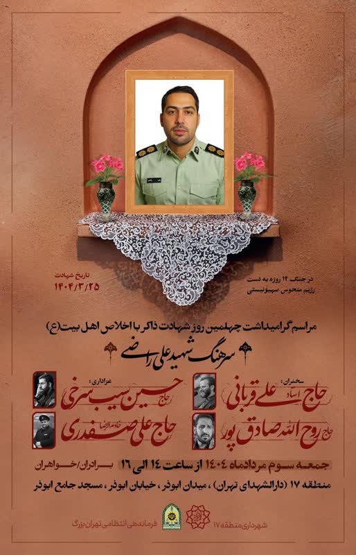 پوستر: اطلاعیه برگزاری مراسم گرامیداشت چهلمین روز شهادت سرهنگ علی راضی