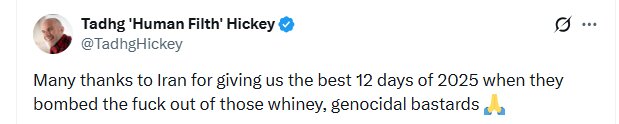 به گزارش خبرگزاری مهر، «تایگ هیکی» فیلم‌ساز، نویسنده، طنزپرداز و فعال ایرلندی در اولین پیام‌های سال میلادی جدید خود در شبکه اجتماعی ایکس از حملات موشکی و تلافی‌جویانه ایران علیه رژیم صهیونیستی در جنگ تحمیلی ۱۲ روزه تشکر و قدردانی کرد.