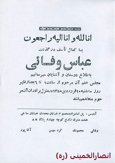 تصویر/ اعلامیه ی مجلس ختم مرحوم مغفور عباس وفایی، پدر شهیدان والا مقام حسین و قربانعلی وفایی (فروردین 1350)