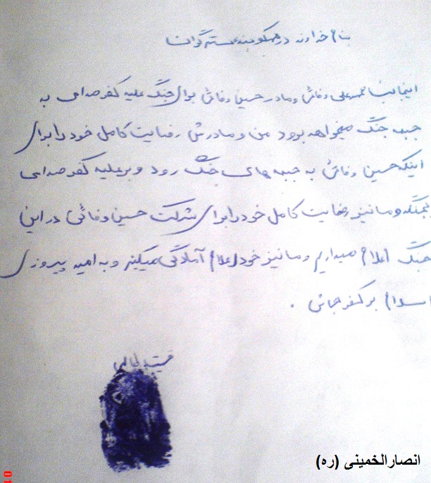 تصویری از رضایت نامه مرحوم محمد علی وفایی(برادر) و والده ی مکرّمه در مورد اعزام شهید حسین وفایی به جبهه