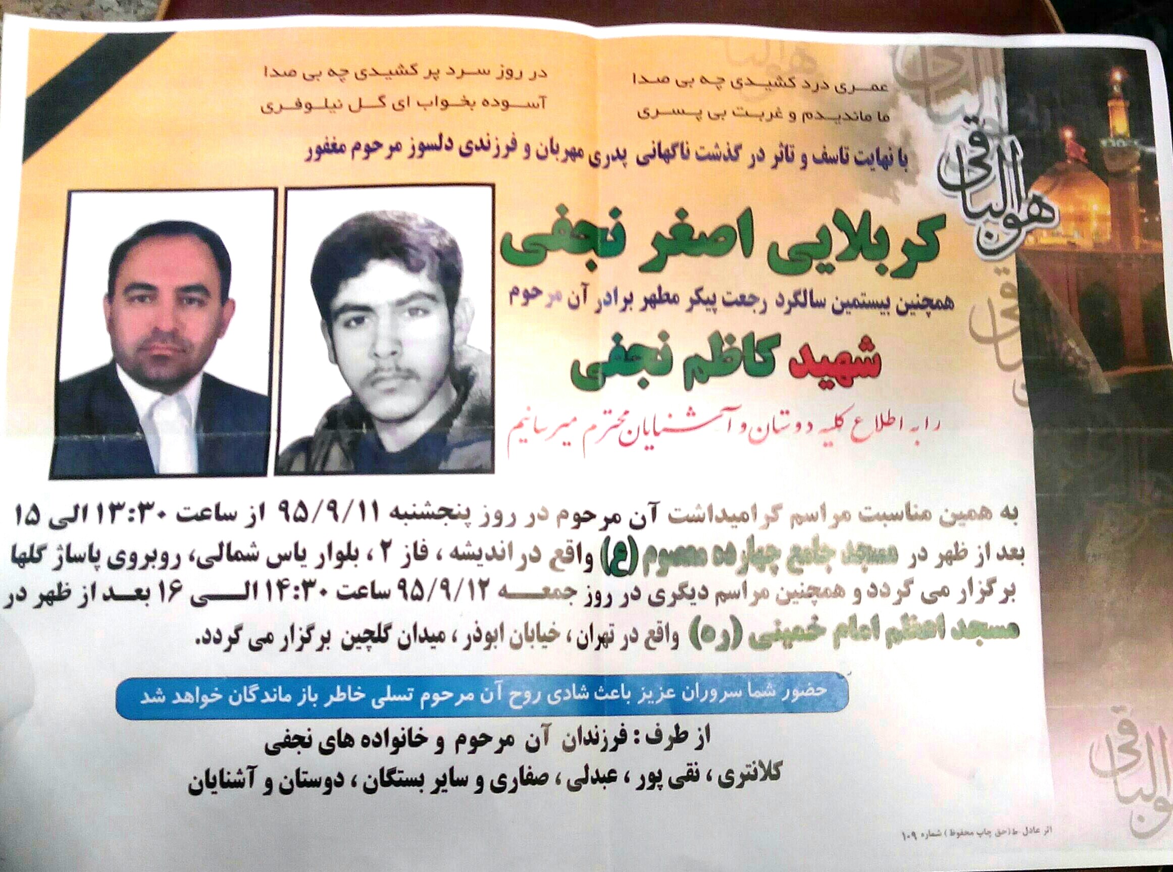 اطلاعیه مراسم بزرگداشت مرحوم کربلایی اصغر نجفی اخوی شهید والامقام کاظم نجفی