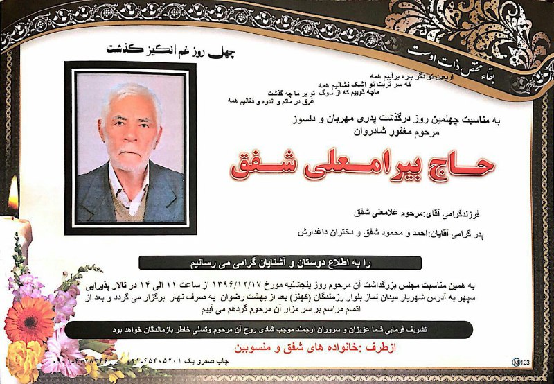اطلاعیه برگزاری مراسم چهلمین روز درگذشت مرحوم مغفور حاج بایرامعلی شفق