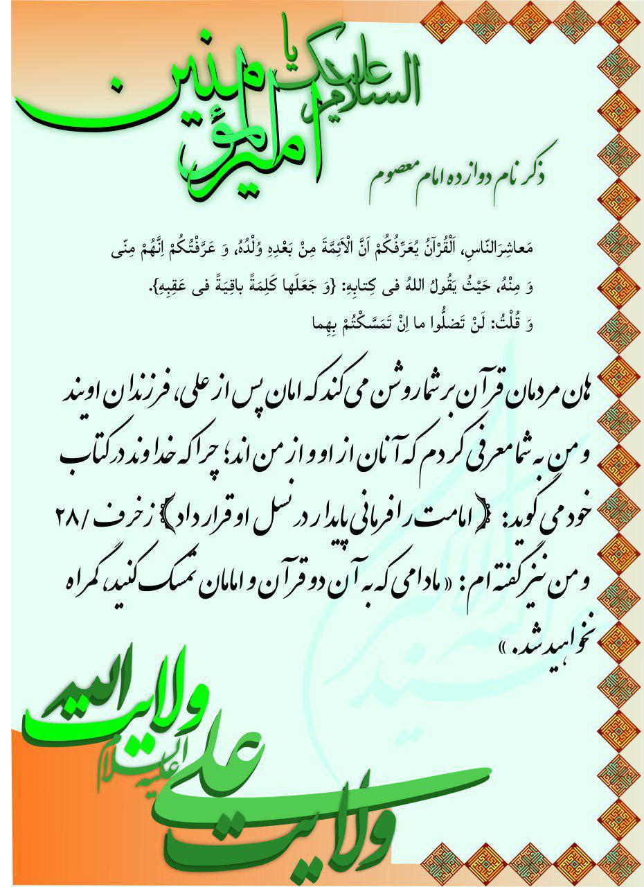 امام خمینی (ره) والله اسلام تمامش سیاست است؛ ***** مقام معظم رهبری: به گفتار امام و کردار امام اهتمام بورزید ***** امام خمینی(ره): ان شاء الله ما اندوه دلمان را در وقت مناسب با انتقام از امریکا و آل سعود برطرف خواهیم ساخت و داغ و حسرت حلاوت این جنایت بزرگ را بر دلشان خواهیم نهاد 1367/4/29 ***** امام خمینی(رحمة الله علیه) : حکومت آل سعود، این وهابیهای پست بیخبر از خدا بسان خنجرند که همیشه از پشت در قلب مسلمانان فرو رفته‌اند 1366/5/12***** امام خمینی (ره) شهادت در راه خدا مسئله ای نیست که بشود با پیروزی در صحنه های نبرد مقایسه شود، مقام شهادت خود اوج بندگی و سیر و سلوک در عالم معنویت است ***** امام خمینی (ره): ما تابع امر خداییم، به همین دلیل طالب شهادتیم و تنها به همین دلیل است که زیر بار ذلت و بندگی غیر خدا نمی رویم ***** امام خمینی(ره) ”من برای آنکه شما جوانان شایسته ای هستید، علاقه دارم که جوانی خود را در راه خداوند و اسلام عزیز و جمهوری اسلامی صرف کنید تا سعادت هر دو جهان را دریابید.„ ***** حُسنُ الخلاقِ یُدِّرُ الرزاقَ وَ یونِسَ الرِّفاقَ؛ خوش اخلاقى روزى ها را زیاد مى کند و میان دوستان انس و الفت پدید مى آورد. «نهج الفصاحه، ح 781»***** امام خمینی(س) علم همراه تهذیبِ نفس است که انسان را به مقام انسانیت می رساند .هم در علم کوشا باشید و هم در عمل و هم در تهذیب اخلاق ***** بايد مسائل اسلامي حل بشود در اينجا و پياده بشود. بايد مستضعفين را حمايت بكنند، بايد مستضعفين تقويت بشوند حضرت امام خميني قدس سره الشريف صحیفه امام – جلد 6 – صفحه 461 ***** اهمیّت فضای مجازی به انداره ی انقلاب اسلامی است "مقام معظم رهبری" ***** آن کسی قلمش قلم انسانی است که از روی انصاف بنویسد. امام خمینی (ره) ***** همان طوري که در سابق عمل مي‌شد، روضه‌خواني بشود، مرثيه گفته بشود، شعر و نثر در فضايل اهل بيت و در مصائب آنها گفته بشود. حضرت امام خميني قدس سره الشريف صحيفه امام – جلد 15 – ص 332 ***** نگذاريد پيشكسوتان شهادت و خون در پيچ و خم زندگي روزمره خود به فراموشي سپرده شوند. حضرت امام خميني قدس سره الشريف صحيفه امام، ج 21، ص 93 ***** من در ميان شما باشم و يا نباشم، به همه شما وصيت و سفارش مي‌کنم که نگذاريد انقلاب به دست نااهلان و نامحرمان بيفتد. حضرت امام خميني قدس سره الشريف صحيفه امام، ج 21، ص 93 ***** پيامبر اسلام نيازي به مساجد اشرافي و مناره‌هاي تزئيناتي ندارد. پيامبر اسلام دنبال مجد و عظمت پيروان خود بوده است که متأسفانه با سياست‌هاي غلط حاکمان دست‌نشانده به خاک مذلت نشسته‌اند. حضرت امام خميني قدس سره الشريف صحيفه امام، ج 21، ص 80 ***** پيغمبر اسلام تمام عمرش در امور سياسي بود، تمام عمرش را صرف كرد در سياست اسلامي، و حكومت اسلامي تشكيل داد. حضرت امام خميني قدس سره الشريف صحيفه امام، ج 15، ص 11 ***** امام به همه فهماند که انسان کامل شدن، علی وار زیستن و تا نزدیکی مرزهای عصمت پیش رفتن افسانه نیست. مقام معظم رهبری ***** راه ما راه امام خمینی است و در این راه با همه قدرت و قاطعیت خود حرکت خواهیم کرد. مقام معظم رهبری