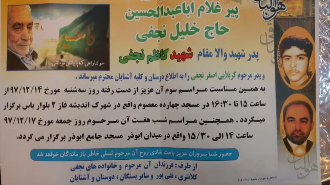 اطلاعیه درگذشت مرحوم مغفور حاج خلیل نجفی