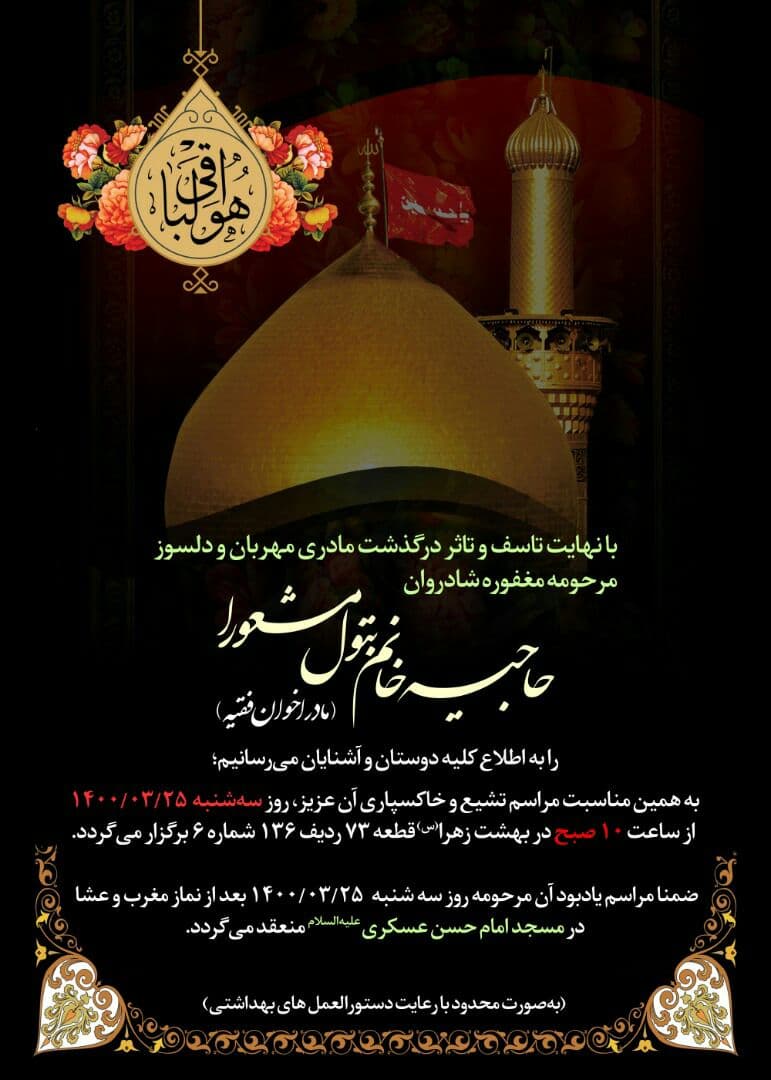 پوستر: اطلاعیه ی درگذشت همسر مکرمه ی حجت الاسلام والمسلمین فقیه (رضوان الله علیه) و والده ی محترمه ی اخوان معزز فقیه