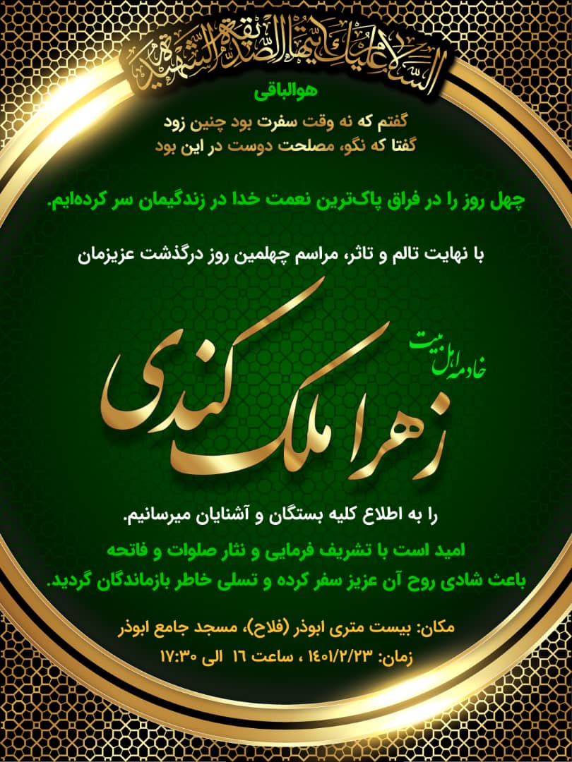 اطلاعیه برگزاری مراسم ترحیم به مناسبت چهلمین روز درگذشت مرحومه مغفوره زهرا ملک کندی