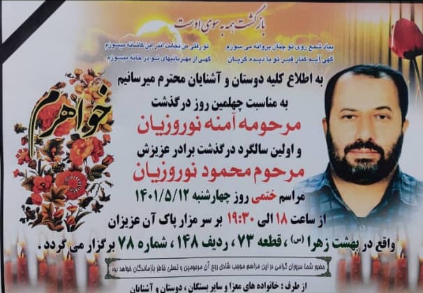 پوستر: اطلاعیه ی چهلمین روز درگذشت مرحومه آمنه نوروزیان و سالگرد مرحوم محمود نوروزیان