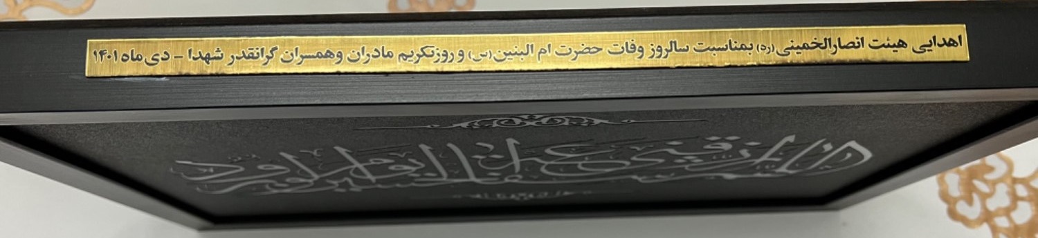 بمناسبت سالروز رحلت حضرت ام البنین (سلام الله علیها) روز تکریم مادران و همسران شهداء تصاویری از کتیبه ی اهدایی هیئت انصارالخمینی (ره) به جمعی از مادران و همسران شهدای مدافع حرم و مدافع امنیت