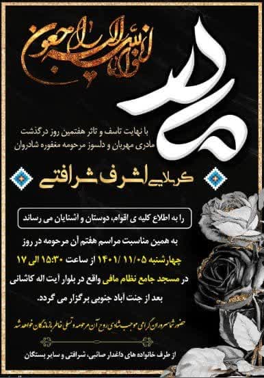 اطلاعیه ی درگذشت و تسلیت پس از درگذشت پدر و برادر ، مرحومه ی مغفوره کربلایی اشرف شرافتی نیز دعوت حق را لبیک گفت