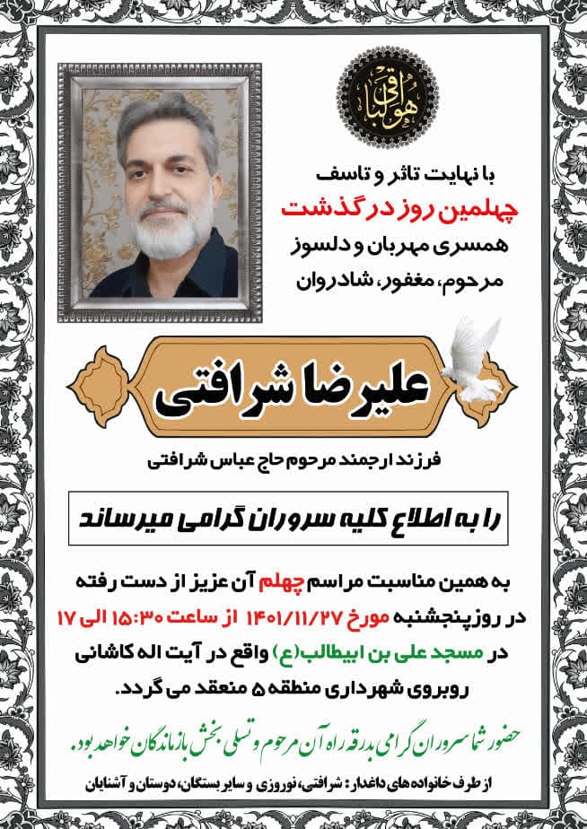 اطلاعیه ی برگزاری مراسم چهلمین روز درگذشت زنده یاد صادق شرافتی