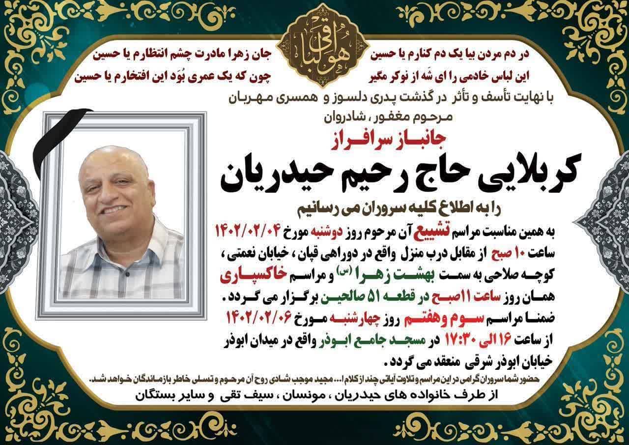 برگزاری مراسم تشییع، تدفین و بزرگداشت زنده یاد حاج رحیم حیدریان