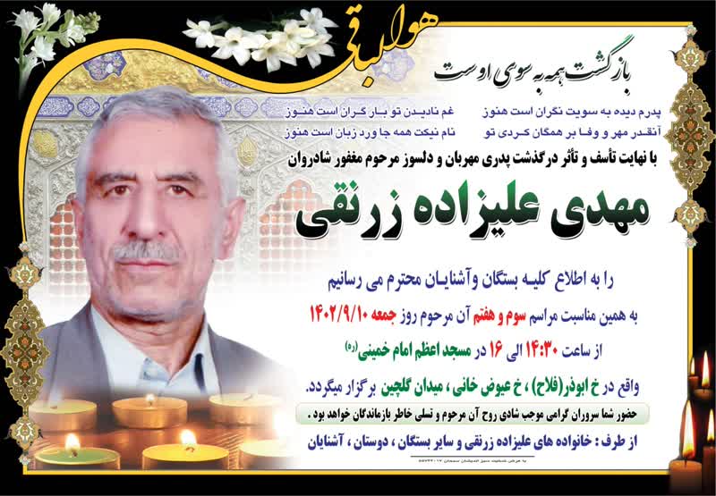 اطلاعیه بزرگداشت و تسلیت زنده یاد آقای مهدی علیزاده به دیدار معبود شتافت