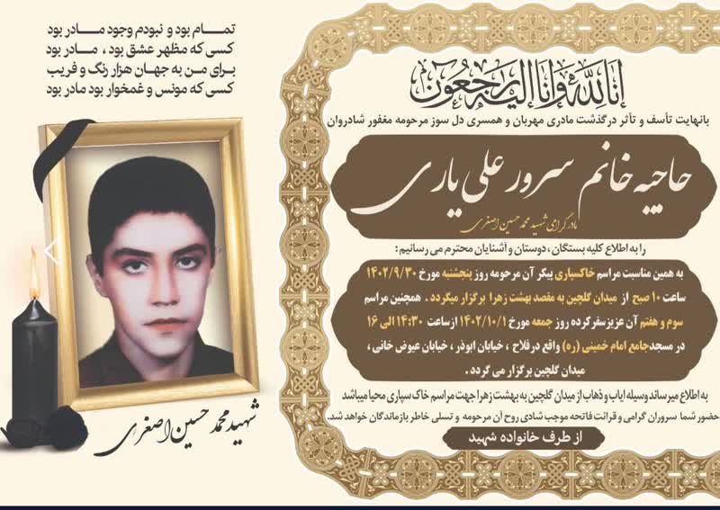 اطلاعیه بزرگداشت و تسلیت والده ی ماجده ی شهید محمد حسین اصغری به دیار حق شتافت