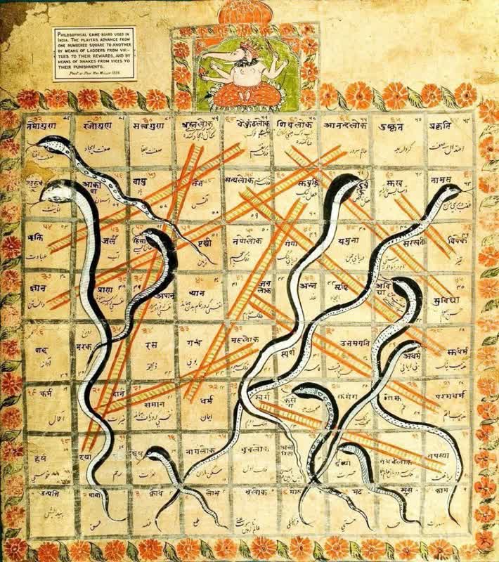 به تصویری از یک صفحه‌ی بازی مار و پله هند، به سال ١٨٩۵ میلادی (۱۲۷۴ شمسی) توجه کنید که متن داخل خانه‌ها به فارسی نوشته شده است.
