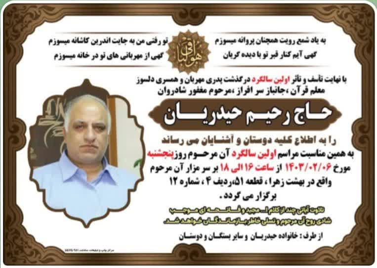 اطلاعیه ی اولین سالگرد رحلت زنده یاد حاج رحیم حیدریان